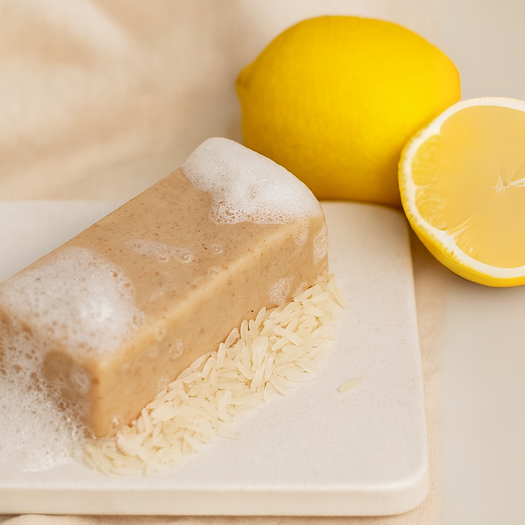 This rice water and preserved lemon shampoo bar is rich and conditioning while helping to remove oiliness and buildup.